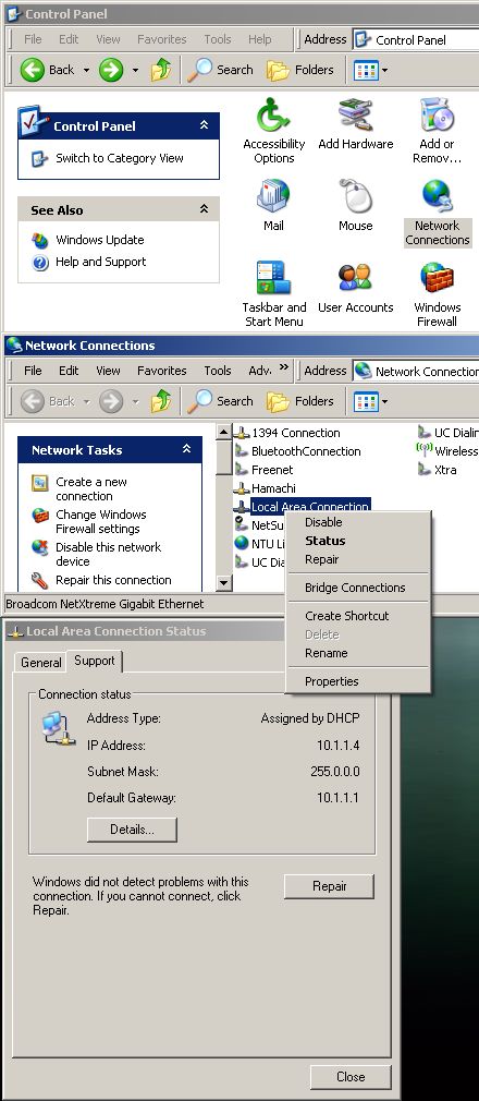 Now that you have ensured that your local IP address will not change, you need to find what the IP address is. The easiest way is to right-click on the networking icon in your system tray (beside the time) and choose ‘Status’, but if that is not available, do the following (following the image below). Go to ‘Start’ -> ‘Control Panel’ -> ‘Network Connections’ -> right-click on ‘Local Area Connection’ -> choose ‘Status’. This will display the ‘Local Area Connection Status’ window (at the bottom of the image below).