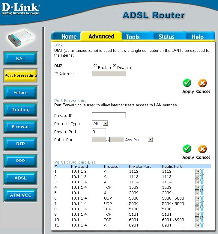 So for this tutorial, we are interested in the first three lines under ‘Port Forwarding List’. If we read line #1, what it means is “Any data that comes in to the router on Public Port 1112 will be sent to the IP Address 10.1.1.2 on Private Port 1112”. ‘Private IP’ means “Local IP Address”, ‘Any’ means “both TCP and UDP data”, ‘Public’ means “on the internet side of the router” and ‘Private’ means “on the local side of the router”. I have purposefully made the ports used match the IP Address, because it makes it very easy to remember the logical settings. You can use any other port from 1024 to 65,534.